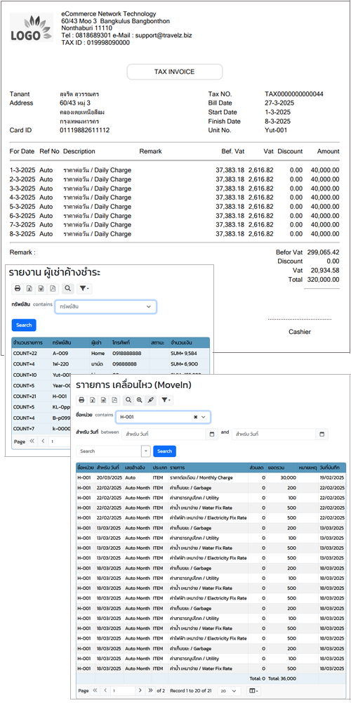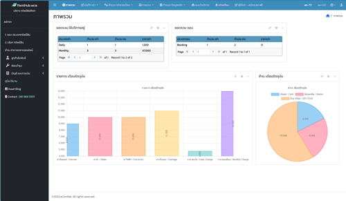 - จำนวน การใช้งาน และสถานะ (ลูกค้าเช่า จอง หรือยังไม่ถูกใช้งาน) รายงานทางการเงิน
